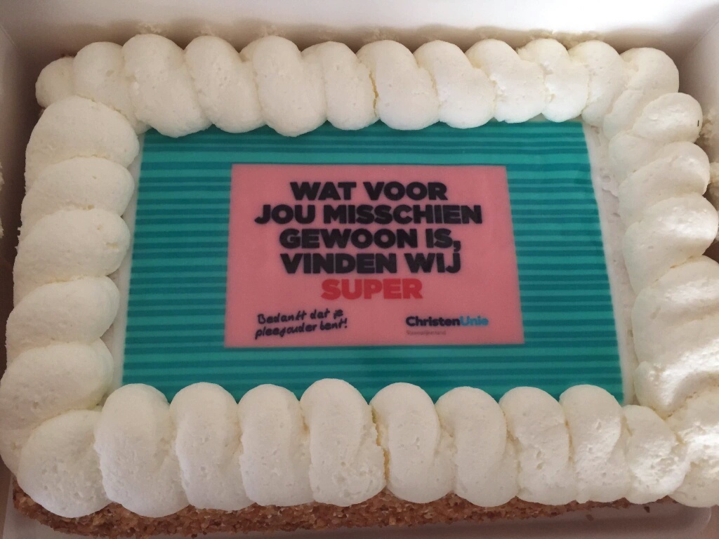 zaterdag 29 oktober 2016 18:28 Wat voor jou misschien gewoon is vinden wij super! Dat staat op de taart die door de ChristenUnie is bezorgd bij drie pleeggezinnen op de eerste dag van de Week van de Pleegzorg. De fractie van de CU wil hiermee aangeven dat pleegzorg in Steenwijkerland enorm gewaardeerd wordt.